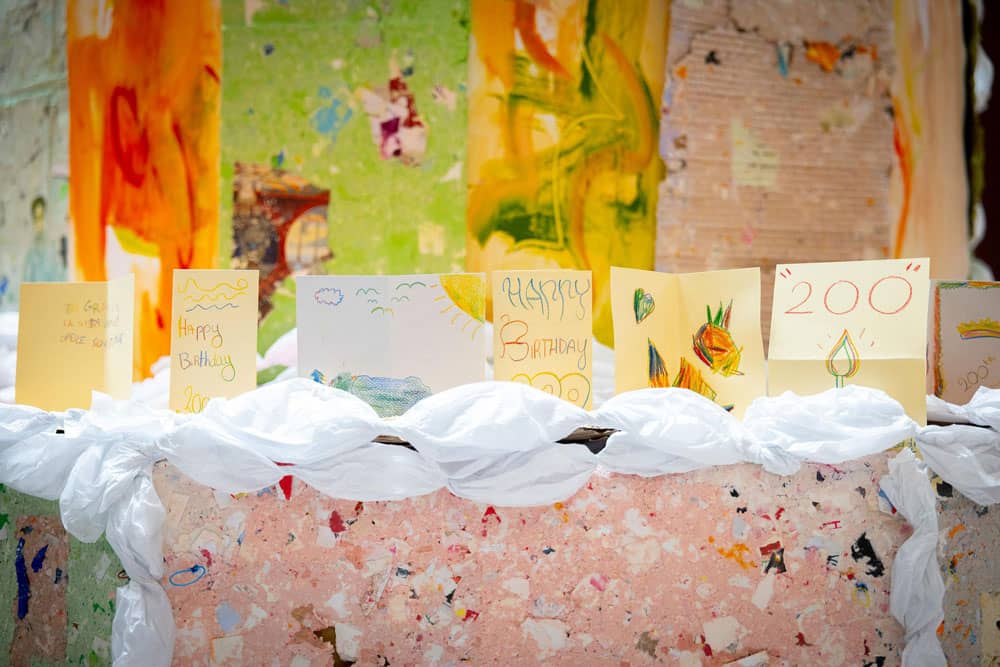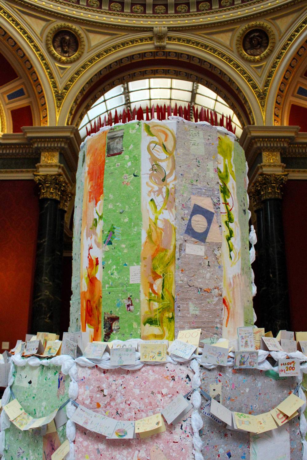 I've just completed a recent commission for the National Gallery in London that took my paper making onto a whole new scale. So increasing the scale of my paper sculptures and constructing them into sculpture was the challenge, and challenge it was. The challenge was firstly creating that much paper pulp! I received a lot of paper donations from friends, family and studio mates. The project was centered around the gallery's 200th birthday, hence the use of birthday cards and construction of a cake sculpture. Many contributors came to my studio and ripped up and pulped their paper archives themselves, which brought an intimate sense of collaboration, story sharing, and co-ownership to the sculpture. The colours of the cards also guided the colours of the panels. Valentine's Day and Christmas cards became the jam centre and Easter cards the inside sponge! The panels were also connected to the specific colours in the galleries art collection and some of the exhibition catalogues also made it into the pulp. I also had to battle the stereotypically British weather of wind and rain during this project. I was drying out the big sheets outside and the bad weather really slowed this part of the process. Typically we got summer heat and sun on the week of the install! So timing and having drying times on our side was a tricky one. ​ The sheer scale of this sculpture (3 metres x 2.2 meters) meant I really pushed my understanding of paper pulping into new ways and constructing a form with flat plains of paper. I also have never made such a large artwork, so it was fascinating to consider how I could frame and embed specific images, textures and colours in the pulp. I always enjoy receiving the Paperslurry newsletter and the niche, accessible and playful sharing it offers, so big thanks for that and it has definitely aided my own art making. I first made paper pulp during 2020 when I was leaving my studio and had various paper hoards. I think the first one I made was done so over my bath and dried out on a towel on my bedroom floor! I had a funny return to this moment 4 years ago, just recently desperately trying to dry out huge paper pulps in my bedroom with all my heaters on! — Lucie MacGregor |